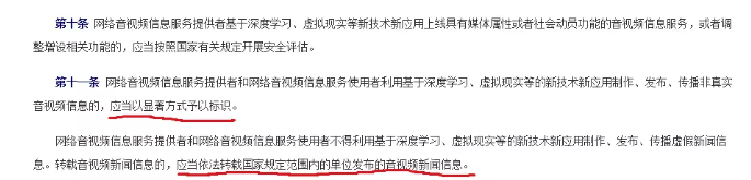 人工智能领域的相关法律是近期才颁布的,主要是拜deepfake这个项目所赐。它的出现让网络内容完全没了可信度可言。为此,今年11月18日颁布的《网络音视频信息服务管理规定》特意为它定制了两条: